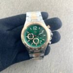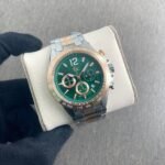 👉🏽 Features: Powered by original Japanese quartz machinery, Stainless-steel silver round case with rose gold marked bezel, mineral crystal glass on a green dial with Rose gold accent, stopwatch chronograph sub-dials and date indicator, fastened by a stainless-steel silver-rose gold two-tone chain with a butterfly clasp.