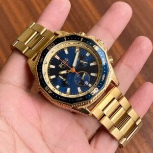 The hands, painted in rose gold Superluminova, gracefully display the day and date, adding a touch of refinement. Crafted with a rust-free black stainless steel metal belt, this watch is designed for men seeking both functionality and fashion. It features a working chronograph and operates with an original Japanese quartz battery, ensuring precision and reliability.