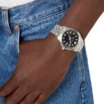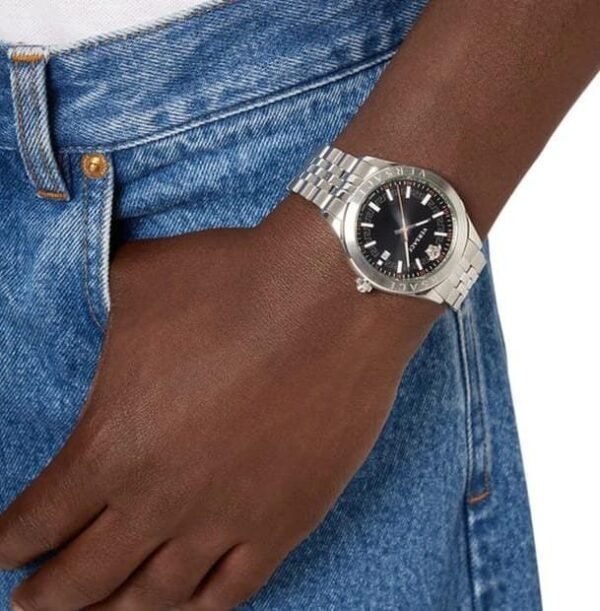 👉🏽 Features: Powered by original Japanese quartz machinery, Stainless-steel silver round case with a gold bezel, Anti-reflective sapphire glass on a black dial with gold indices and hands, fastened by a stainless-steel silver chain with a butterfly clasp.